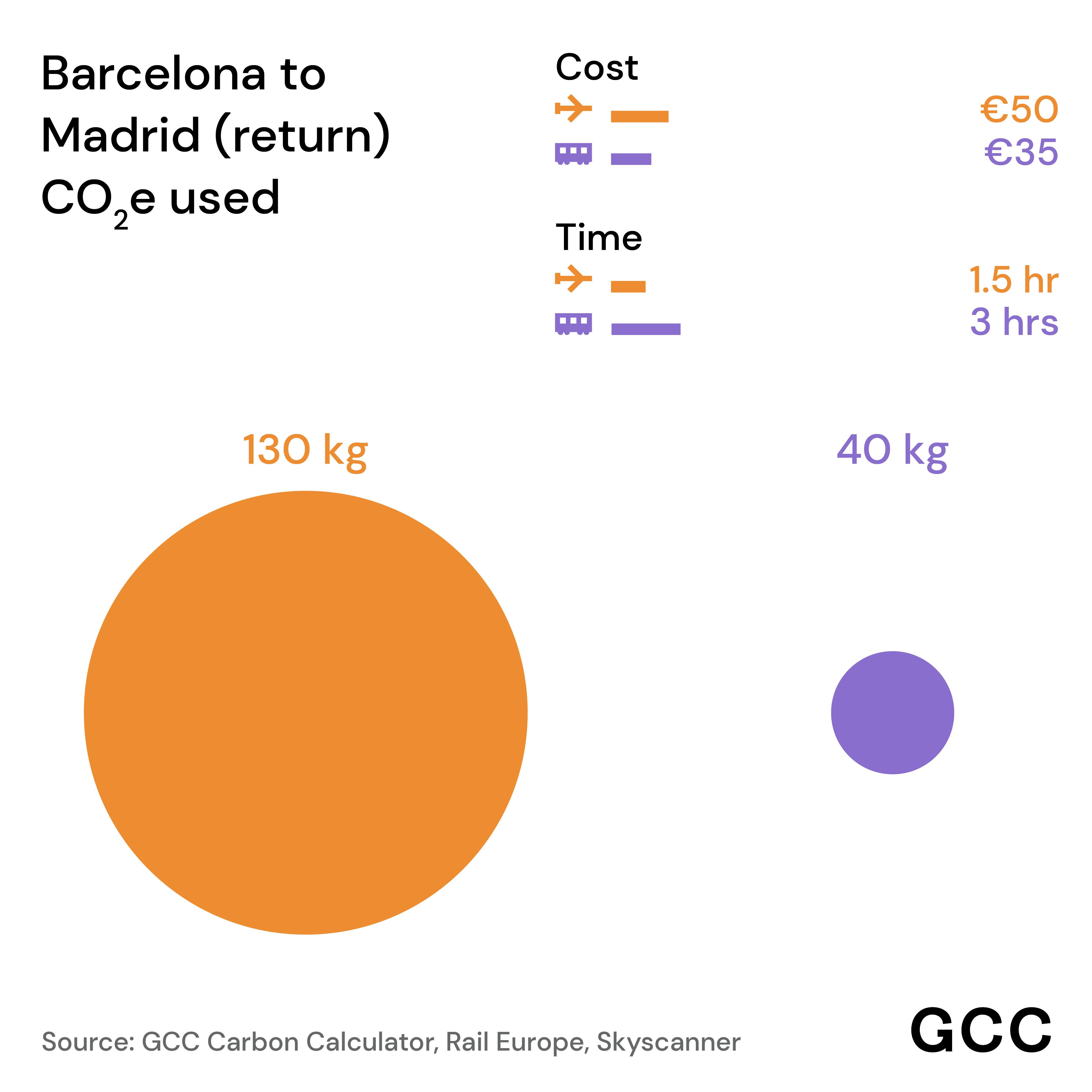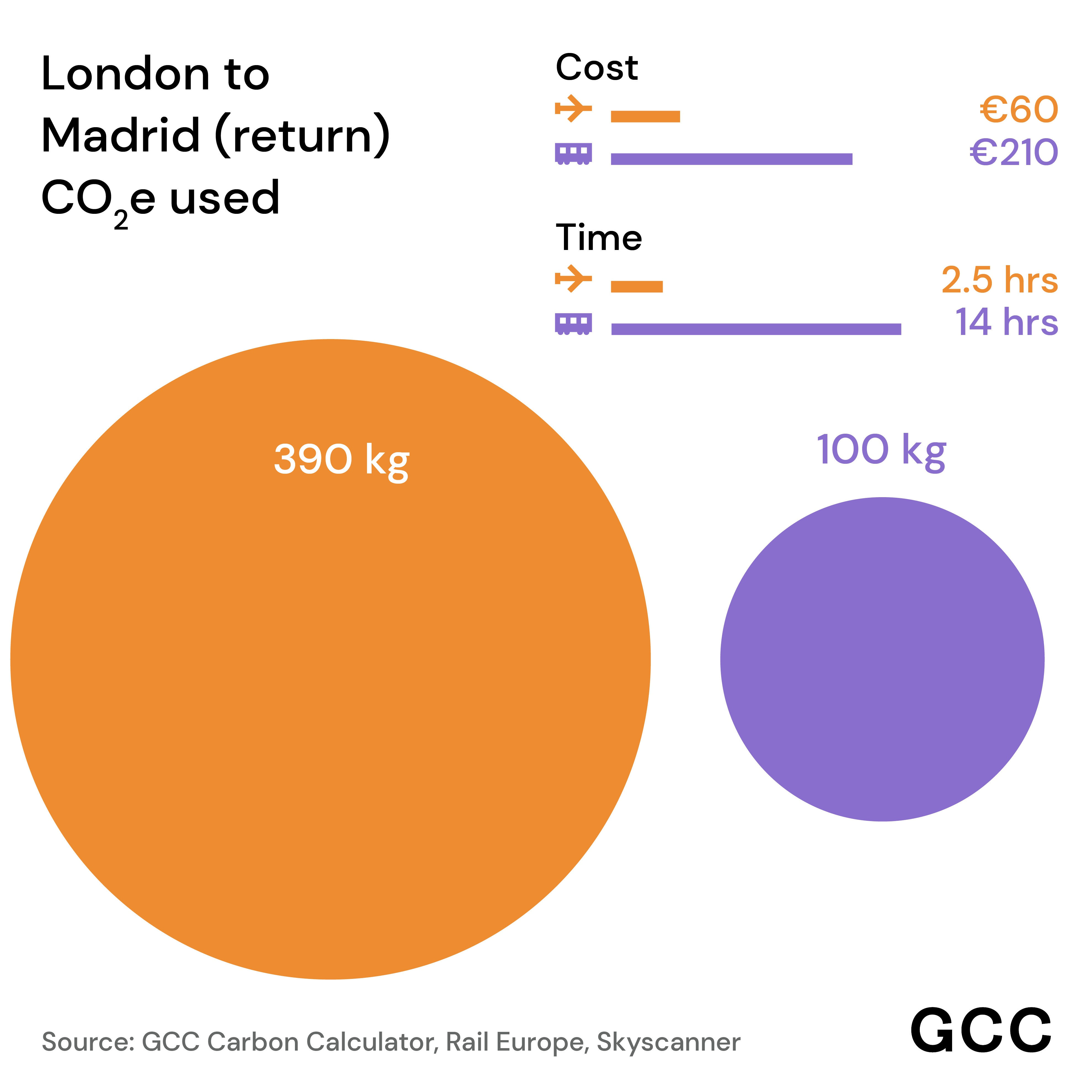Most importantly, the carbon savings we make by taking the train are huge. We’ve compared emissions generated by return journeys by train and plane between Madrid and Barcelona, Valencia, Paris, and London–and you can see what a difference it makes: